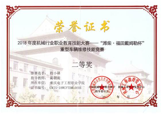本次大赛由机械工业教育发展中心和全国机械职业教育教学指导委员会主办,第45届世界技能大赛重型车辆(技术)项目国家队专家组组长刘庆华教授担任总裁判长。赛项设置包含柴油发动机拆装与测量、柴油发动机故障诊断与排除、共轨喷油器检测与维修、整车电器故障诊断与排除四个模块。大赛完全遵循世界技能大赛重型车辆技术项目全国选拔赛技术标准,着重考核选手的安全意识、规范操作以及诊断思路。在欠缺重型车辆实训设备实践练习的条件下,程小林同学凭借扎实的基本功、过硬的心理素质、稳定的临场发挥,以第四名的好成绩获得了二等奖。
