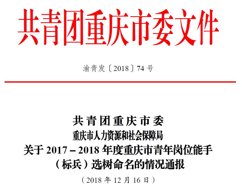 共青团重庆市委、重庆市人力资源和社会保障局于2018年12月16日联合发文(渝青发〔2018〕74号)对2017-2018年度重庆市青年岗位能手(标兵)选树命名情况进行了通报,我院朱游兵老师获得重庆市青年岗位能手(标兵)荣誉称号。