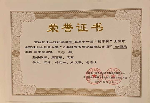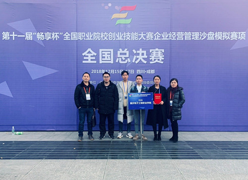 2018年12月15-17日,由全国电子商务职业教育教学指导委员会和中国职业技术教育学会创业教育专业委员会联合主办的第十一届“畅享杯”全国职业院校创业技能大赛企业经营管理沙盘模拟赛项全国总决赛在四川成都职业技术学院举办。pg国际电子与物联网学院派出的由教师周言敏、王君指导,学生汪菲、杨茂林、肖庆军、包香山组成的代表队,夺得该项赛事团体三等奖。