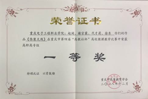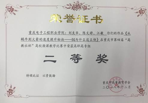 2018年12月,重庆市高等教育学会2018学术年会暨重庆市第四届高校微课大赛颁奖大会在重庆工商职业学院召开;pg国际通信工程学院在本次微课大赛中获得优异成绩,其中赵阔、谢宗霖、代才莉和徐东老师的参赛微课作品《伪装天线》荣获一等奖,刘良华、陈文婷和江敏老师的参赛作品《从蜗牛到火箭的速度提升秘诀——5G为什么这么快》荣获二等奖。