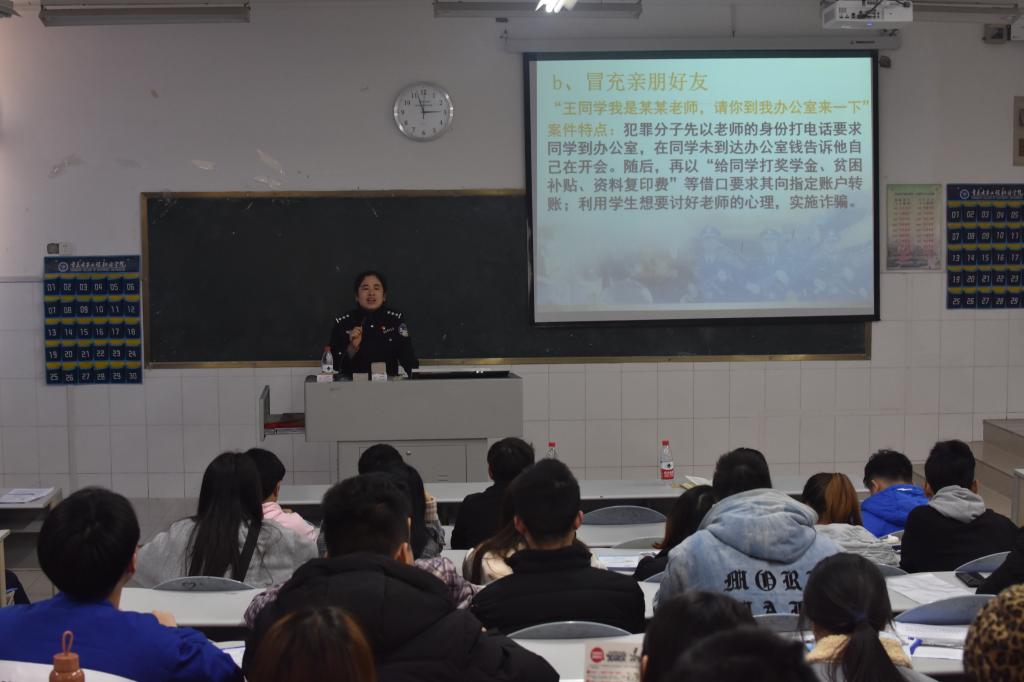 培训会开始,全体观看焦点访谈《网上谍影》,让同学们意识到“维护网络安全和国家秘密安全,是各级涉密单位、涉密人员乃至全社会的共同责任。”随后,退伍消防战士熊浩然老师为大家讲解消防安全知识及灭火逃生方法,贴近实际,通俗易懂,使同学们强化了消防安全意识。接着,谯新风处长讲到,作为高校团学干部,必须提高自我防范意识,具有良好的警惕性,能及时发现问题并能及时反馈,同时具备一定的安全宣讲能力。最后蔡清警官详细地介绍了目前常见的三种诈骗方式——电话诈骗、短信诈骗、网络诈骗,揭秘了诈骗的套路。重点介绍了网络借贷的危害,提醒大家:一要树立防范意识、不轻信天上掉馅饼的事;二要注意个人信息的保护;三要加强防范涉及汇款等银行业务;四要加强与警方配合,切实保护人身财产安全。