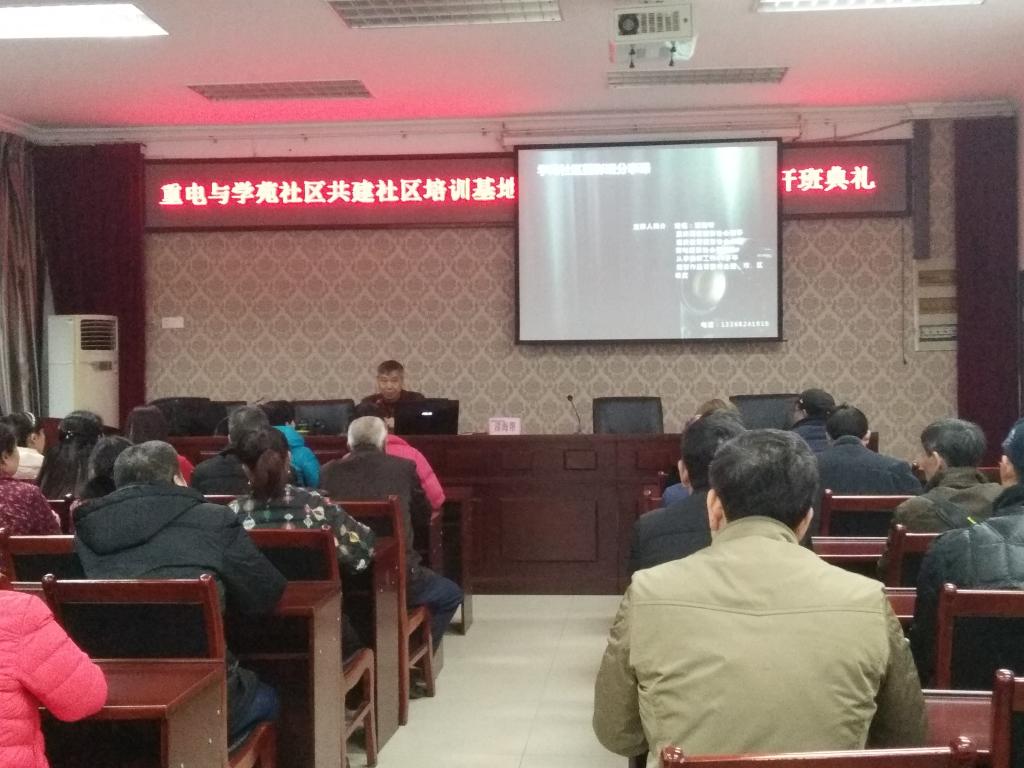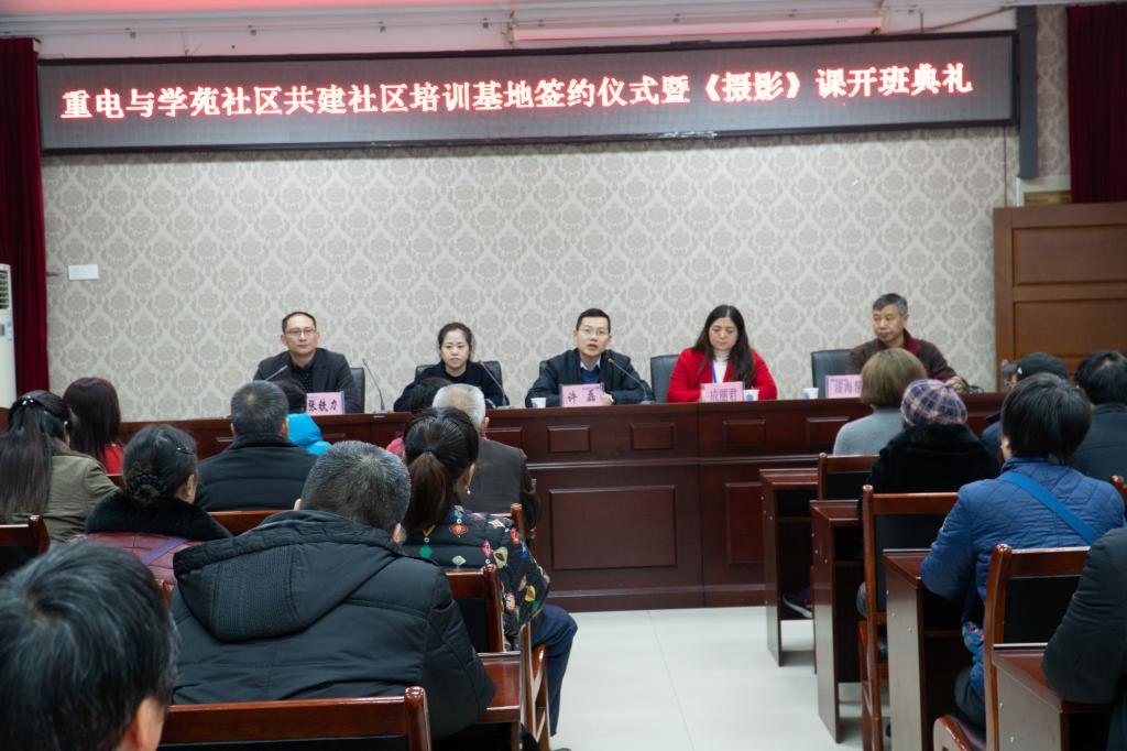 11月29日下午,重庆电子工程职业学院与陈家桥街道学苑社区共建社区教育培训基地签约仪式暨《摄影》专业培训开班典礼在培训与继续教育中心1-101培训室顺利举行。重庆电子工程职业学院科研与社会服务处处长许磊、培训与继续教育中心副主任、项目组负责人张铁力、学苑社区居委会副主任杜利华、《摄影》课程培训教师漆海帮以及38名社区学员参加仪式,仪式由张铁力主持。