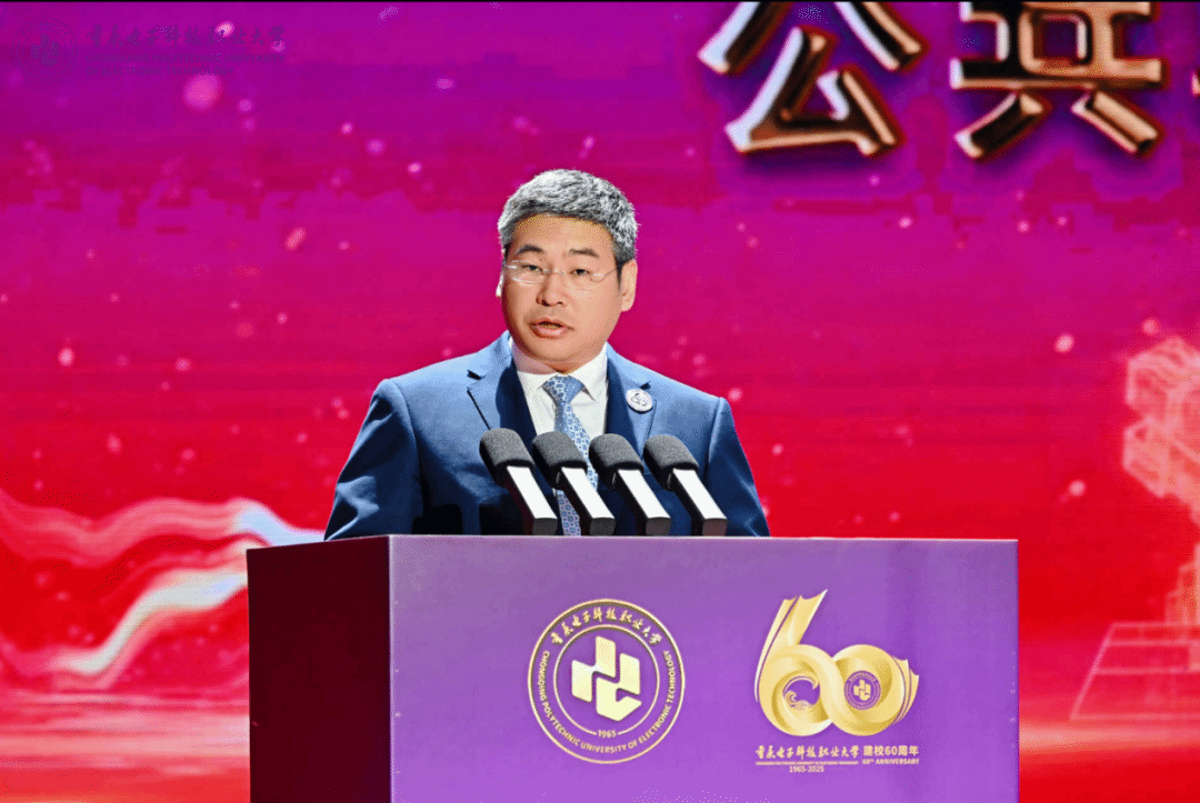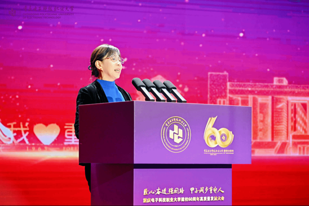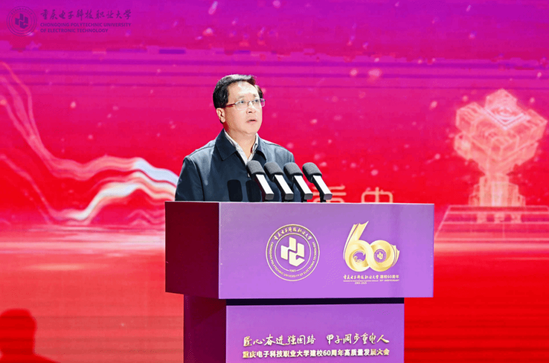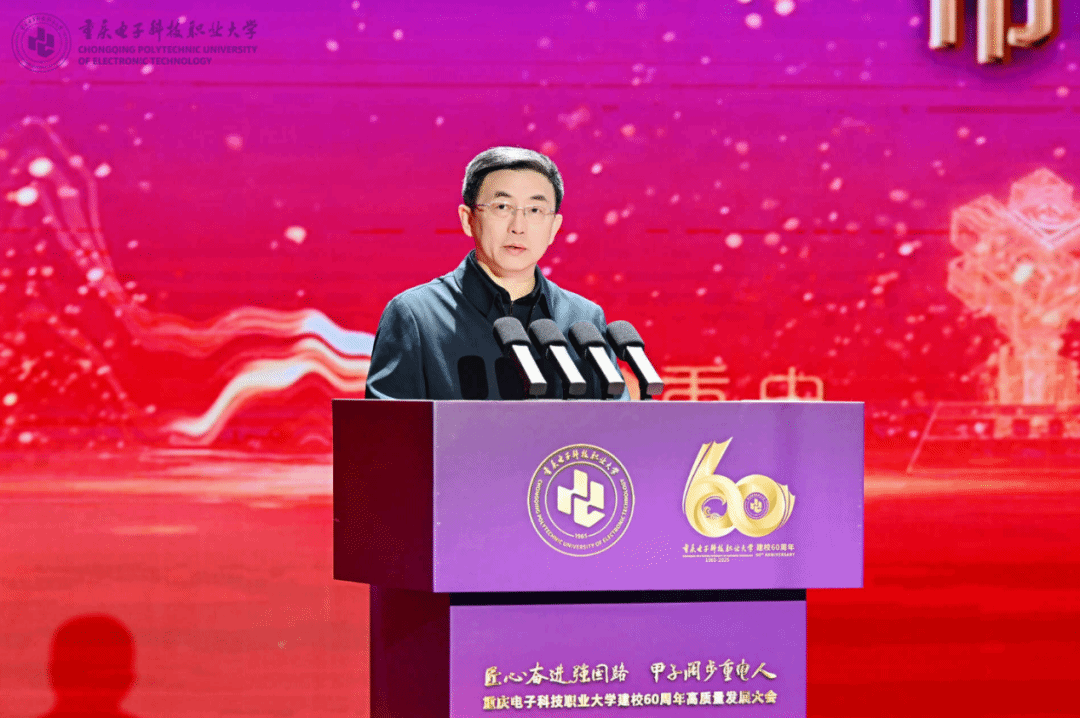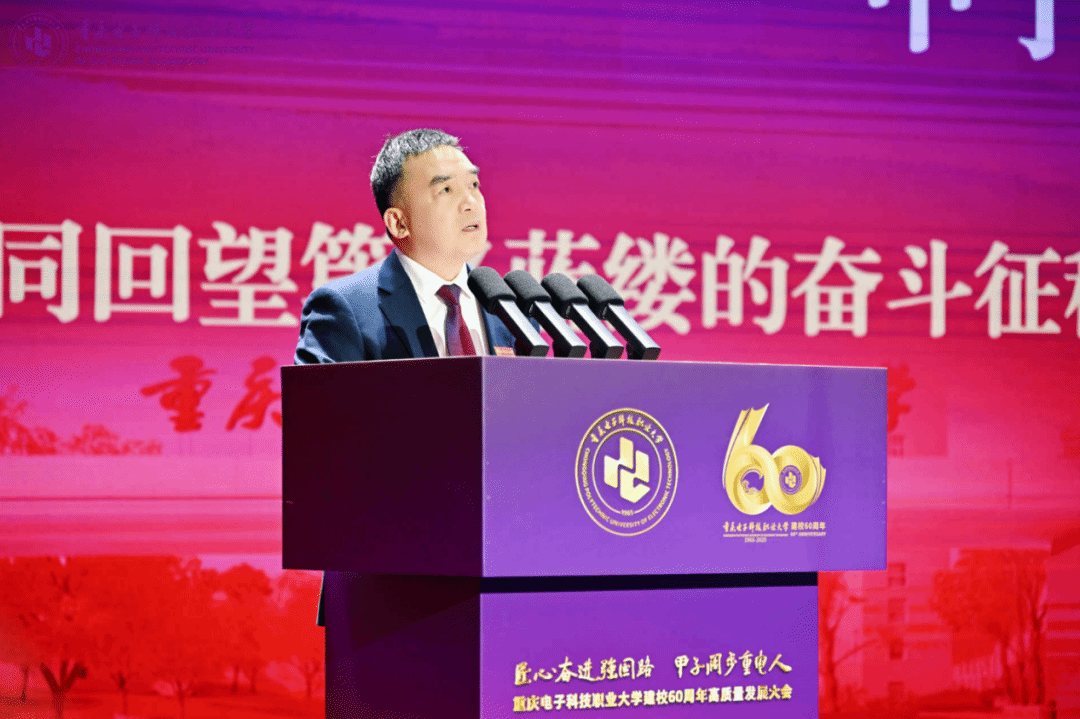 在建校六十周年之际,校党委副书记、校长聂强作学校发展报告。他指出,学校历经一甲子发展,已从默默无闻稳步攀升至全国高职院校前列,并于2024年成功升格为重庆市首所公办本科层次职业大学。六十年来,学校始终坚持党的全面领导,落实立德树人根本任务,秉持“人才强校、文化兴校、特色立校”理念,深耕电子信息领域,在人才培养、党建思政、专业建设、技能竞赛、产教融合及科技创新等方面取得丰硕成果,为服务国家战略和地方发展作出了重要贡献。面向未来,学校将坚守职业教育类型定位,锚定建设“全国顶尖、世界一流职业技术大学”的目标,奋力谱写高质量发展新篇章。