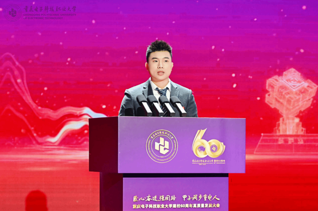 校友代表、青年教师李小松分享了从学生到教师的成长历程。作为学校2021届光电显示技术专业毕业生,李小松于2019年代表学校参加在日本京都举办的光电技术国际邀请赛并获得金牌。他坦言,这份荣誉不仅是个人的成果,更是母校匠心育人传统的体现。在建校六十周年的新起点上,李小松表达了对母校培育之恩的感激,并呼吁广大校友同心携手,共同传承重电精神,以扎实的技能报效国家,回应时代召唤。