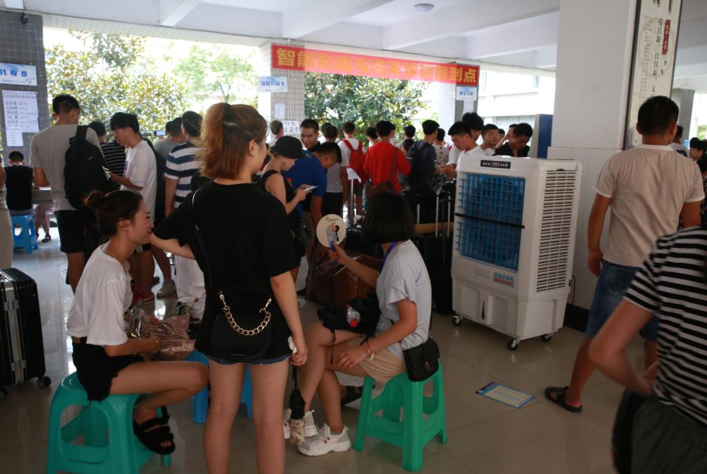 由于迎新期间天气炎热,学校特意在各个报名地点提供了制冷大空调等防暑设施,为现场的工作人员、新生以及家长营造一个更加舒适的报道环境。