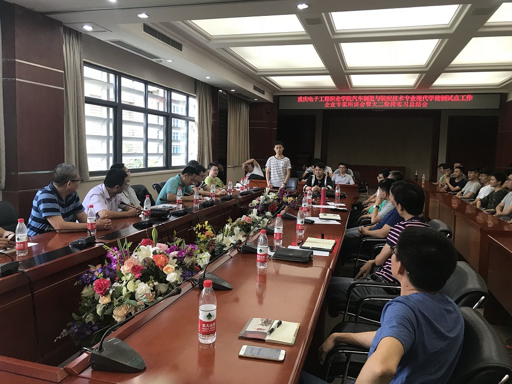 2018年7月17日,为了推进现代学徒制试点工作的有效开展,pg国际智能制造与汽车学院在博润厅举行了汽车制造与装配技术专业现代学徒制试点工作专家交流会暨学生企业学习(轮岗实习)总结会。德尔福派克电气系统有限公司重庆分公司、重庆杰信联众机械有限公司和重庆迈奥汽车设计有限公司等10家企业的专家,我院党总支书记罗永前、副院长叶勇和相关实习指导教师,以及汽车制造与装配技术专业2016级全体实习学生出席了交流总结会。