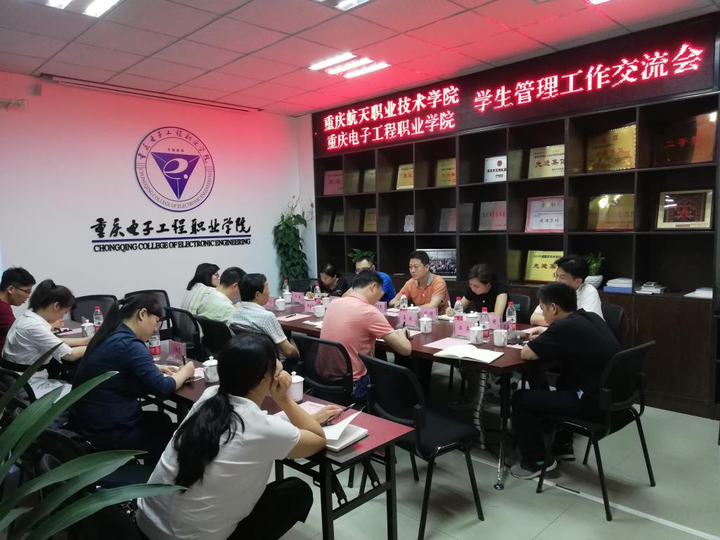 2018年5月18日下午,重庆航天职业技术学院学工部部长何杰民一行7人到pg国际交流学生管理工作。pg国际党委学生工作部部长何光明、副部长蒋斌、数字媒体学院党总支副书记钟佐彬等领导及相关工作人员参加了交流座谈。