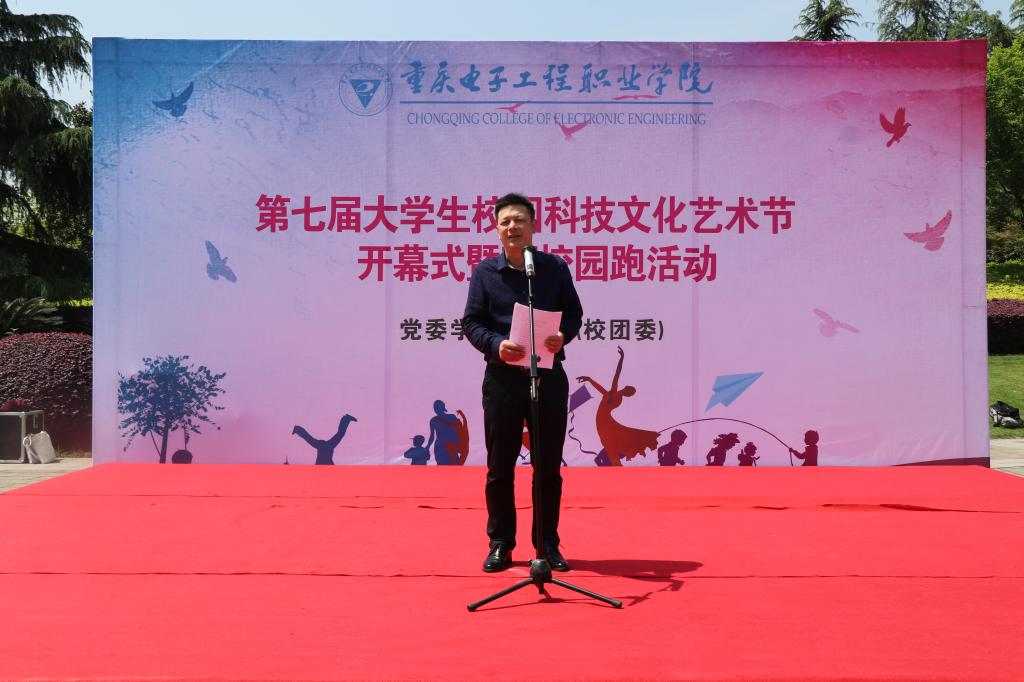 2018年4月3日,由党委学生工作部(校团委)主办的第七届大学生校园科技文化艺术节暨环校园跑活动在学子广场顺利举行。校党委副书记唐玉林,党委学生工作部部长何光明,党委学生工作部副部长蒋斌,党委学生工作部副部长、校团委书记钟佐彬,通信工程学院党总支书记黄正伟,软件学院党总支书记王文,汽车工程学院党总支书记张红斌,传媒艺术学院党总支副书记袁勇,管理学院党总支副书记廖坤科,各二级学院团总支书记及学生代表共200余人参加了开幕式。