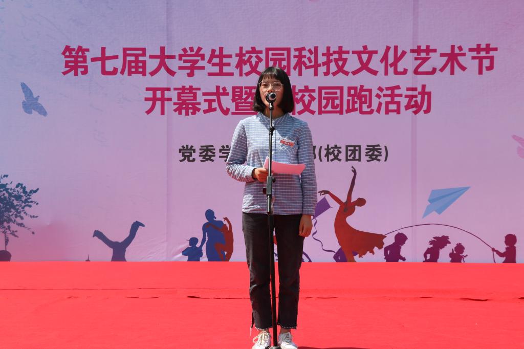 开幕式在一段热情澎湃的街舞中拉开帷幕,何光明部长宣读了本次科技文化艺术节活动项目,在为期两个月的时间内将陆续开展环校园跑、戏曲进校园、“律动青春”校园十佳歌手大赛、“韵动青春”大学生“五人制”足球赛等十六项比赛和活动。随后,学生代表田朴岑发言,她说到,科技文化艺术节就是我们学习的第二课堂,我们需要丰富多彩的课外活动来提升我们的综合素质,我们始终要高扬理想信念旗帜,在校园中大力弘扬主旋律、传播正能量,牢固树立“四个意识”,承担历史责任,争做时代的弄潮儿。
