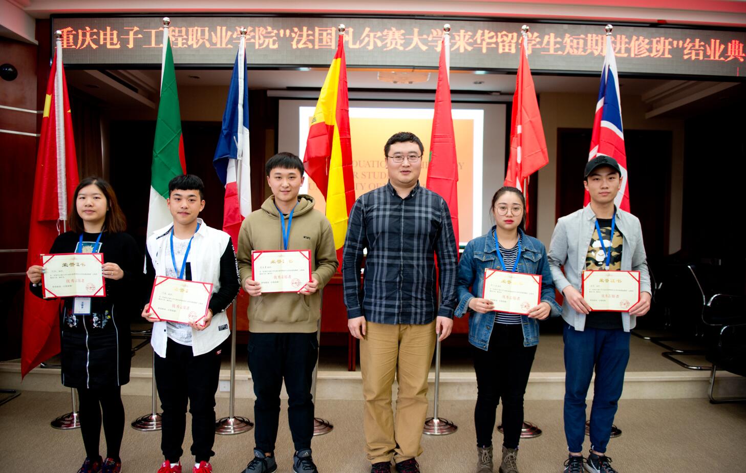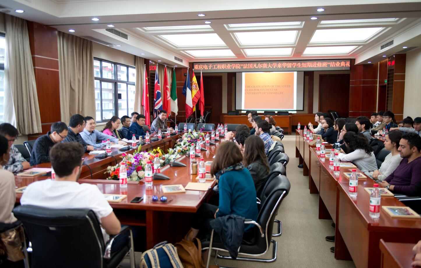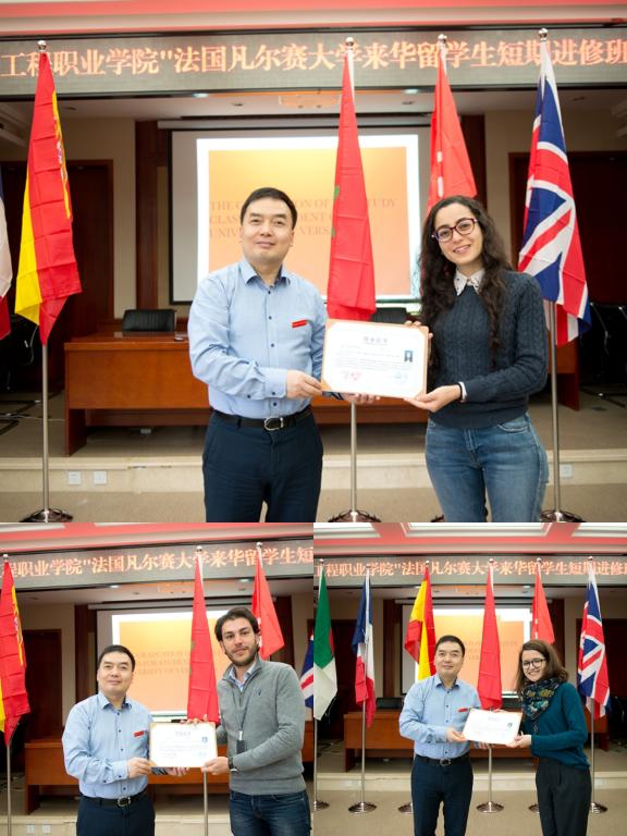 结业典礼上,聂强校长为22名来自法国凡尔赛大学企业经济管理专业的研究生们颁发了来校留学进修结业证书并致辞,唐莉书记宣读了优秀学生志愿者表彰决定,任树磊主席为优秀学生志愿者颁发了证书并致辞。