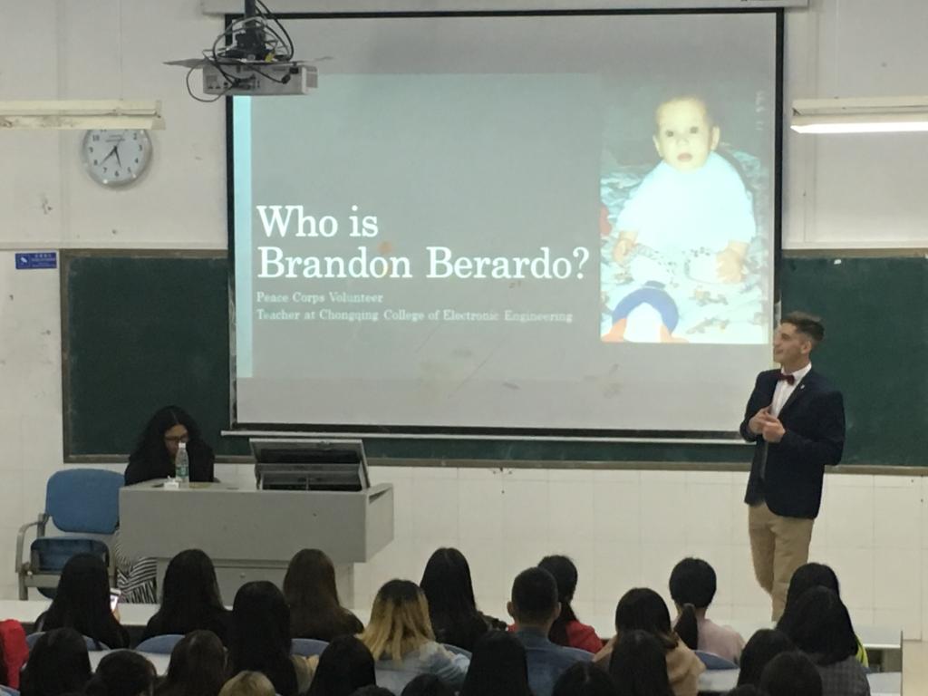 180人的大教室座无虚席,人头攒动,连教室两旁和最后一排都站满了晚来的学生。两名外教首先对自己的教育背景、兴趣爱好、家庭成员等做了自我介绍,同时简短讲解了美国和平队的中国项目——“美中友好志愿者”项目的基本情况。接着同学们和外教互动讨论,为后期的“英语角”活动主题提出建议。现场同学们积极参与,踊跃发言,现场气氛十分活跃。
