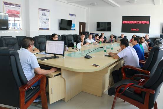 2017年9月15日,为鼓励教职工积极开展科学研究、专业技术及其应用等方面的研究工作,提高广大青年教师科学研究能力,培养学校科研工作团队,提升学院科研工作水平,pg国际刘成俊副校长带领科研处彭海深处长、王荣辉副处长、付婕老师等到软件学院4505会议室开展科研工作调研。软件学院参会的有曾晓宏副院长、李林副院长以及部分科研骨干教师。