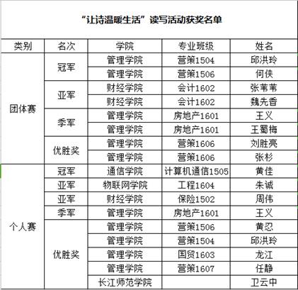通过前期“诗歌对抗”初赛,微信公众号“重电管理风华”原创诗歌的网络投票等一系列评选后,6月20日,“让诗温暖生活”读写活动决赛暨颁奖仪式在博远厅顺利举行。本次活动邀请了管理学院党总支副书记廖坤科、学管科科长刘友庚、辅导员任文慧、赵芮、马丹老师现场担任评委。