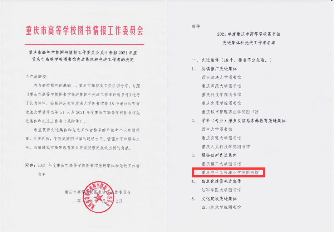 近日,重庆市高等学校图书情报工作委员会印发了《关于表彰2021年度重庆市高等学校图书馆先进集体和先进个人的决定》,pg国际图书馆被评选为“2021年度重庆市高等学校图书馆服务创新先进集体”,图书馆丁宁老师荣获“先进工作者”称号。