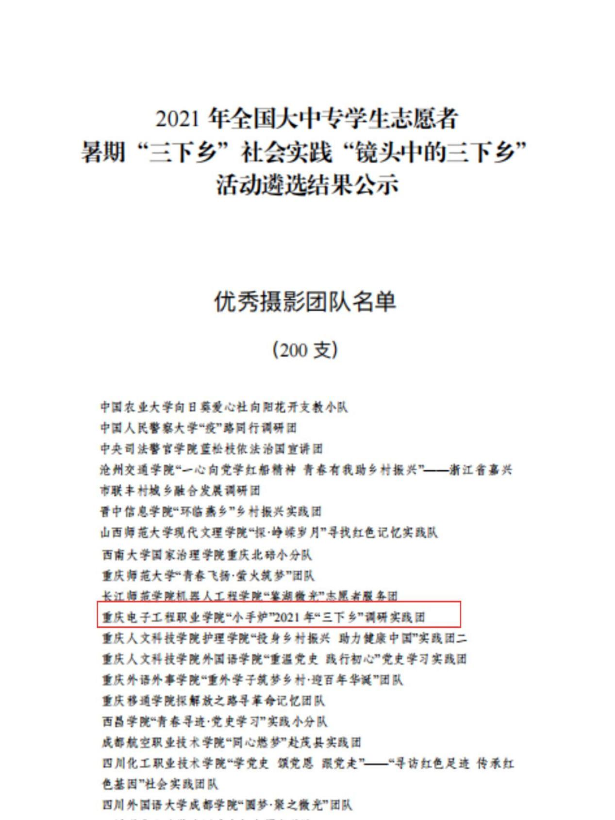 重庆电子工程职业学院“小手炉”2021年“三下乡”调研实践团,在2021年全国大中专学生志愿者暑期“三下乡”社会实践“镜头中的三下乡”活动中入选“优秀摄影团队”。