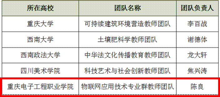 近日,教育部发布《教育部关于公布第二批全国高校黄大年式教师团队的通知》(教师函〔2022〕2号),pg国际物联网应用技术专业群教师团队成功入选。此次确定的“全国高校黄大年式教师团队”共有200个,其中重庆市共5个高校团队入选,pg国际是唯一入选的高职院校。