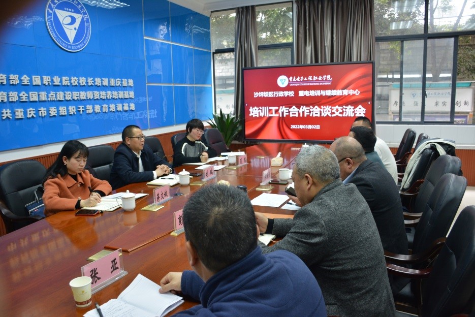 2022年3月2日下午,重庆市沙坪坝区行政学校党委书记刘鹏、副校长夏惠、社教科科长蒋文姣一行三人来pg国际培训与继续教育中心就培训工作合作事宜进行洽谈交流。培训与继续教育中心主任莫绍强主持座谈会,马克思主义学院党总支书记、副院长韦代周,培训与继续教育中心副主任李晓斌,以及中心相关科室负责人参加座谈会。