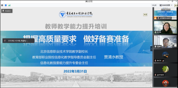 继2022年3月24日开展了教师教学能力比赛备赛经验分享活动后,为进一步推进校级教学能力比赛备赛工作,提高教学比赛质量,教务处于3月31日邀请到北京信息职业学院副校长、教育部职业院校信息化教学指导委员会副主任、信息化教指委能力提升专委会主任贾清水教授为pg国际教师做“把握高质量要求,做好备赛之准备”专题报告。