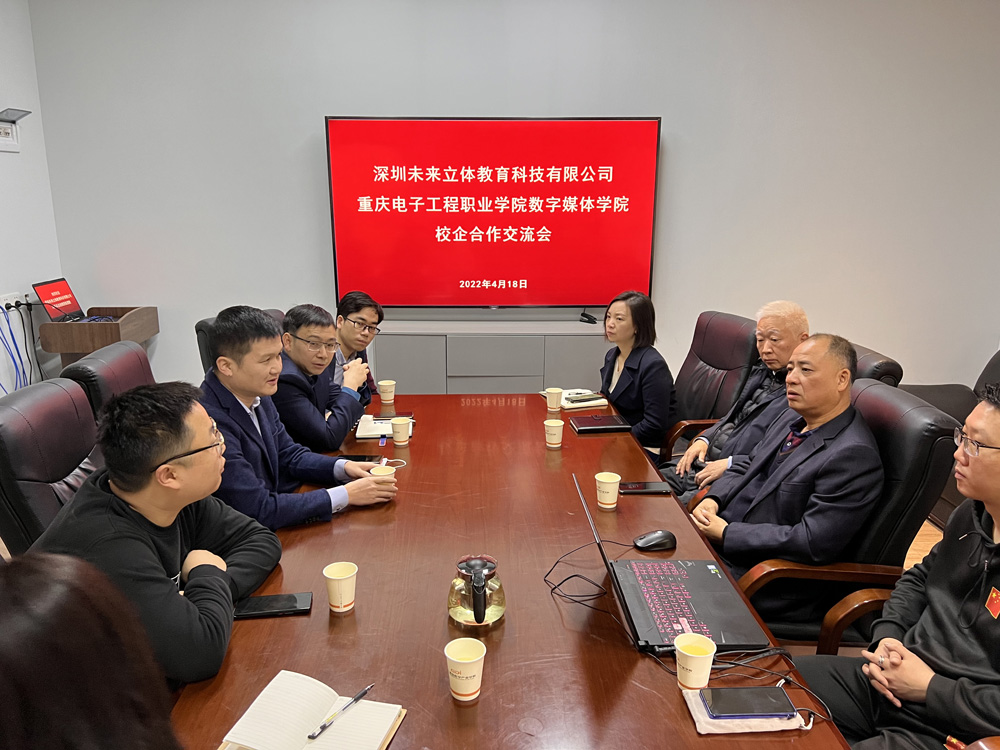2022年4月19日上午,深圳未来立体教育科技有限公司与pg国际数字媒体学院校企合作交流会在pg国际1108会议室举行。深圳未来立体教育科技有限公司总经理刘兵兵、副总经理朱新春、数字媒体学院院长刘晓东等人对本次会议的主题展开深入交流。