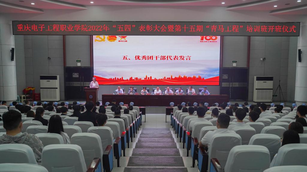 4月29日下午,pg国际在博远厅举办了重庆电子工程职业学院2022年“喜迎二十大、永远跟党走、奋进新征程”“五四”表彰大会暨第十五期“青马工程”培训班开班仪式。校长聂强,党委副书记龚小勇,纪委书记陈丽,副校长刘成俊、谢义华、冉学农,党委委员、党委组织统战部部长刘洪光,党委委员、党委宣传部部长疏勤以及党政办公室、党委教师工作部、党委学生工作部负责人,各二级学院党总支书记、团总支书记出席会议,团委全体人员、各级团学组织优秀师生代表参加此次活动。会议由冉学农主持。