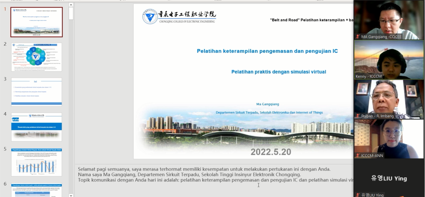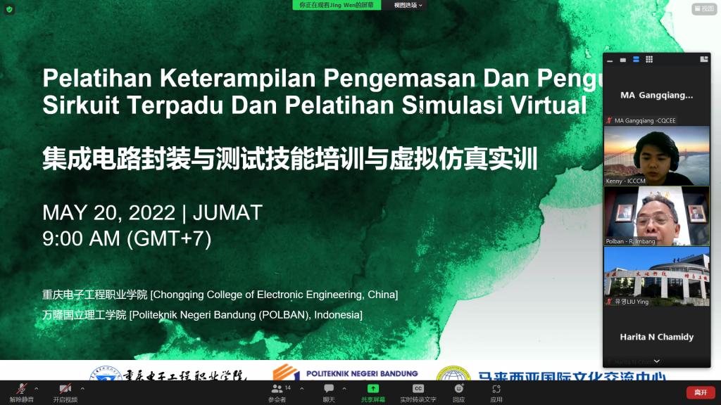 培训由集成电路系主任马岗强主讲,培训围绕集成电路人才需求、专业群建设、1+X标准、集成电路封装与测试开展,并依托pg国际国家级虚拟仿真实训基地开展线上实训。通过培训,印尼参培师生对集成电路专业技能、集成电路专业群建设、虚拟仿真实训教学有了较为清晰的认识和全面的了解。