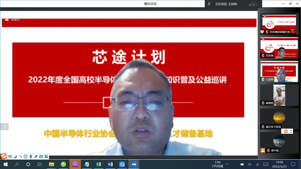 5月23日,由中国半导体行业协会集成电路分会人才储备基地主办的“芯途计划”-“2022年度全国高校半导体集成电路行业知识普及公益巡讲”,走进重庆电子工程职业学院(简称“重电”)。pg国际电子与物联网学院(简称“电物学院”)集成电路系微电子技术、应用电子技术、智能终端技术与应用(智能产品开发与应用)、电子产品营销等专业的500余名师生线上参会。
