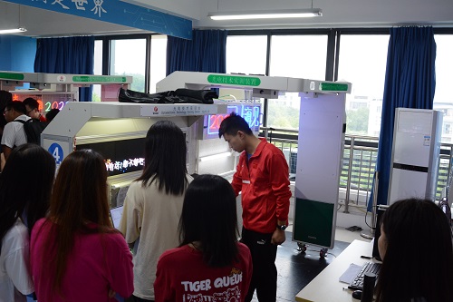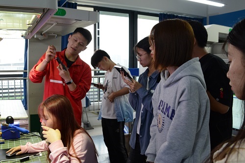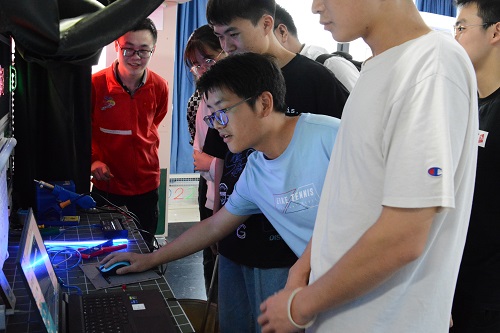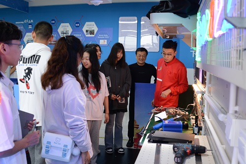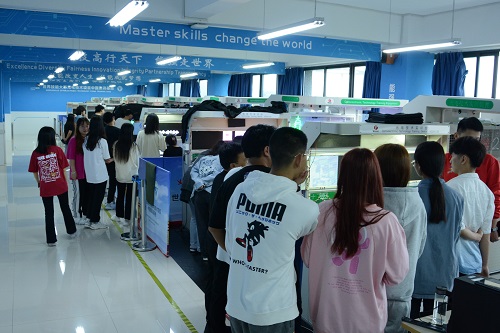 讲座结束后,同学们参观了世赛光电基地技能训练中心。为吸引更多同学关注、热爱并投身“光电”事业中来,光电技术项目国家队五名选手分5个工位为同学们精心设计了展示内容,由每位选手为同学们详细讲解自己项目设计原理、制作方法和调试步骤等,感兴趣的同学还可以自行体验,参观活动现场选手们讲得乐此不疲,同学们听得津津有味,现场气氛热烈。
