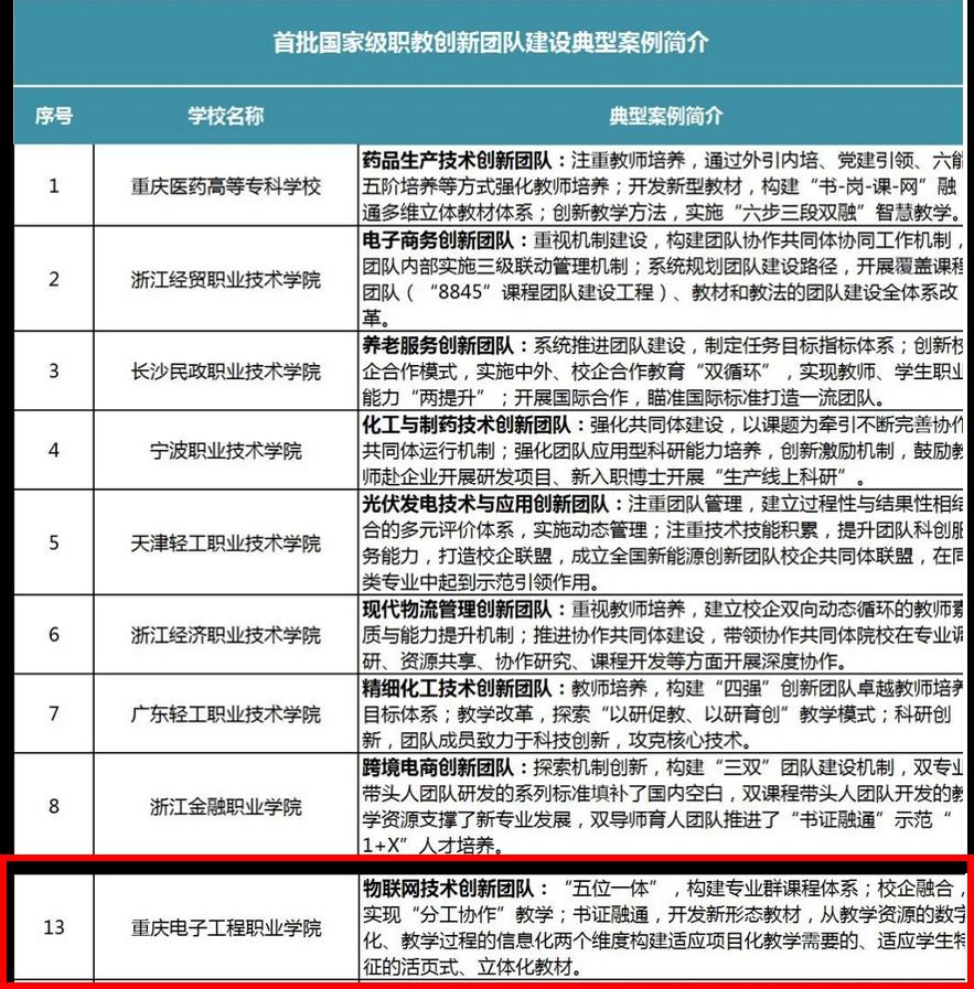 本次公布了13个省市职教教师队伍建设经验做法和30个全国职业教育教师教学创新团队建设典型案例。pg国际物联网应用技术专业国家级教育教师教学创新团队以“德能双修、务实协作、融合创新”为宗旨,立足职业教育高质量发展,依托物联网国家双高专业群、国家物联网产业示范基地(重庆)、陈良国家级技能大师工作室、新大陆物联网学院等优势资源,通过“大师引领、模组协同、书证融通”等举措打造模组结构化“双师协同”教师队伍,深化“三教”改革。