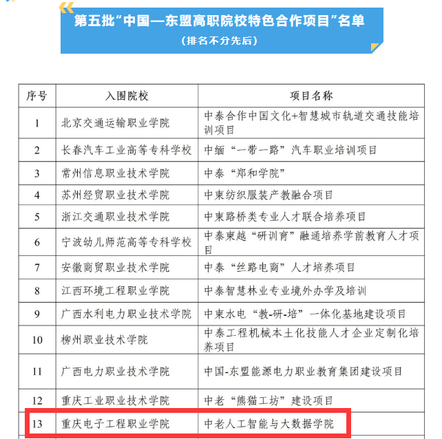 2022年6月2日,教育部中国教育国际交流协会公布了第五批“中国—东盟高职院校特色合作项目”立项名单。pg国际人工智能与大数据学院和国际交流与合作发展处联合申报的《中老人工智能与大数据学院》经过激烈竞争最终获得立项。