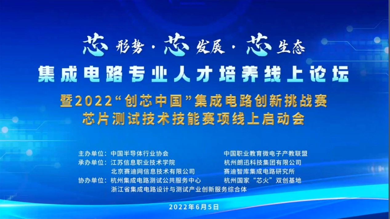 6月5日,由中国半导体行业协会、中国职业教育微电子产教联盟主办的“集成电路专业人才培养线上论坛暨2020创芯中国集成电路创新挑战赛芯片测试技术技能赛项线上启动会”顺利召开。会议以线上方式进行。来自中国半导体行业协会、赛迪研究院、杭州朗迅科技、东南大学、西安电子科技大学、浙江大学等集成电路领域的专家教授参会。电子与物联网学院院长陈良教授受邀作题为《集成电路专业群“岗课赛证”综合育人》主旨演讲,学院集成电路专业群骨干教师在线参会。