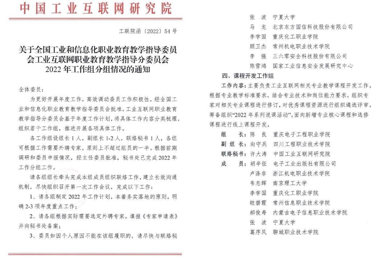 近日,全国工业和信息化职业教育教学指导委员会(简称“工信行指委”)工业互联网职业教育教学指导分委员会(简称“工业互联网分委会”)秘书处(中国工业互联网研究院代章)发布关于2022年工作组分组情况的通知。根据分组安排,pg国际电子与物联网学院院长陈良教授担任课程开发工作组组长、教师培训工作组成员。电子与物联网学院课程建设中心徐小辉教授受聘为课程开发工作组外聘专家,工业互联网技术专业杜雪飞教授受聘为教材编制工作组外聘专家,物联网应用技术专业徐欣教授受聘为课题研究工作组外聘专家。