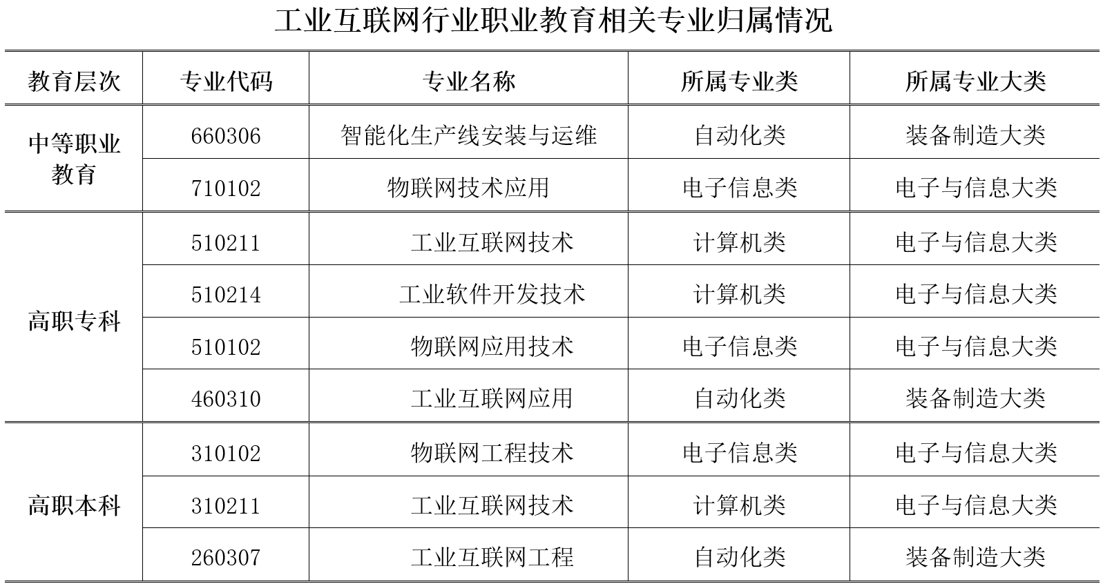 对照《职业教育专业目录(2021)》,根据职业教育与成人教育司和行业职业教育教学指导委员会工作办公室有关要求,工业互联网行业包含9个相关专业。其中,中等职业教育专业2个,分别为智能化生产线安装与运维、物联网技术应用专业;高职专科专业4个,分别为工业互联网技术、工业软件开发技术、物联网应用技术、工业互联网应用专业;高职本科专业3个,分别为物联网工程技术、工业互联网技术、工业互联网工程专业。
