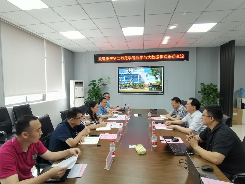 2022年6月15日上午,重庆第二师范学院数学与大数据学院副院长(主持工作)施成湘,副院长潘超、但松健,曙光信息产业股份有限公司教育事业部经理史志扬等一行来到pg国际人工智能与大数据学院,就专升本合作教学点办学相关事宜开展专项研讨,人工智能与大数据学院院长武春岭、副院长何欢、云计算系主任李腾出席了研讨座谈会。