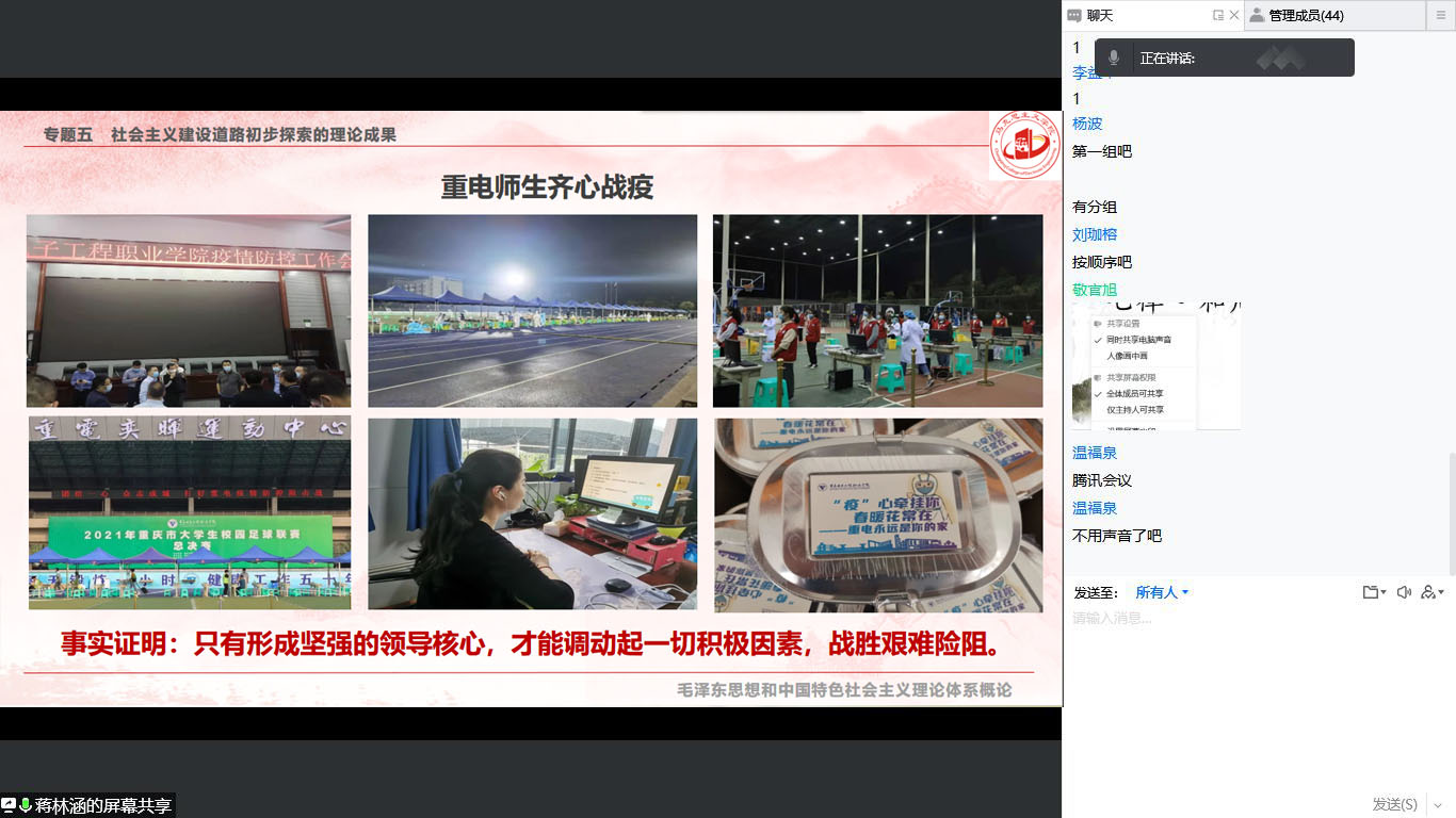 以防疫为契机,抓好线上教学。今年3月中旬,在周边高校出现疫情后,为保证全体师生健康安全,学校全面启动疫情防控应急机制,实行校园封闭管理,师生连夜进行全员核酸筛查,课堂教学即时由线下转为线上,全校师生员工紧密团结、同心战“疫”。马克思主义学院思政课教师利用线上教学渠道,及时链接校园热点,把学校防疫政策措施传达给学生,引导学生遵守防疫规定,做好个人卫生防护,使全校防疫宣传教育形成合力。同时,总结凝练师生齐心防疫的生动实践,绘声绘色讲好重电防疫故事,以身边人身边事拉近师生课堂距离,让学生既接受了防控疫情的形势政策教育,又深化了对课程知识理论的理解和把握。