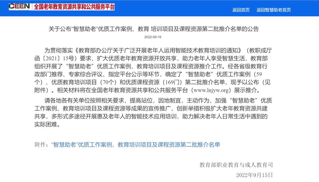 为贯彻落实《教育部办公厅关于广泛开展老年人运用智能技术教育培训的通知》(教职成厅函〔2021〕15号)要求,教育部职成司组织开展了“智慧助老”优质工作案例、教育培训项目及课程资源推介工作,旨在积极扩大老年教育资源共建共享,多形式多途径开展惠及老年人的智能技术应用培训,助力解决老年人日常生活中遇到的实际困难。此次公布的第二批名单中包括“智慧助老”优质工作案例59个、优质教育培训项目70个和优质课程资源169门。