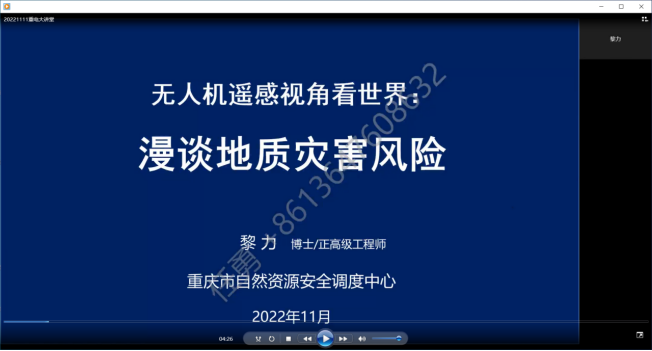 为营造良好科研氛围,推动pg国际科研工作迈上新台阶,11月11日,重庆市自然资源安全调度中心黎力博士应pg国际智能制造与汽车学院邀请,开展了“无人机遥感视角看世界:漫谈地质灾害风险”的专题讲座,由于疫情原因,本次重电大讲堂活动通过腾讯会议举行,共有150余名师生参加了本次讲座。