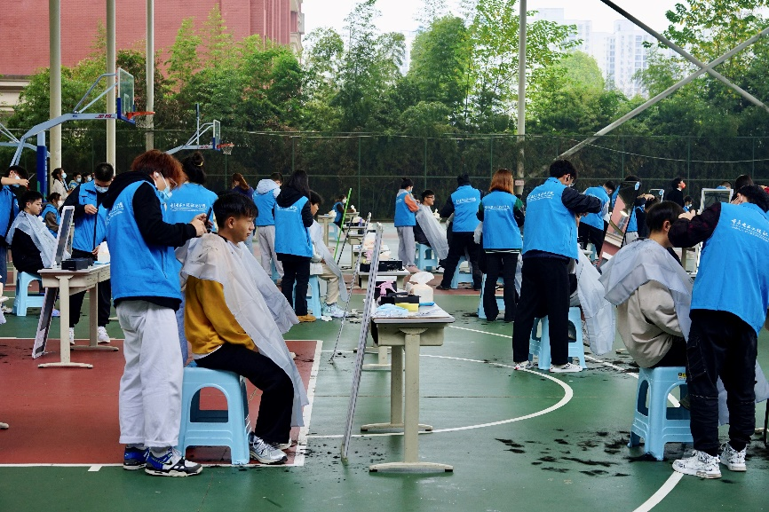 11月23日中午,重庆电子工程职业学院风雨球场上一片繁忙的景象,127名志愿者身披马甲、戴着口罩,正熟练地为师生理发。