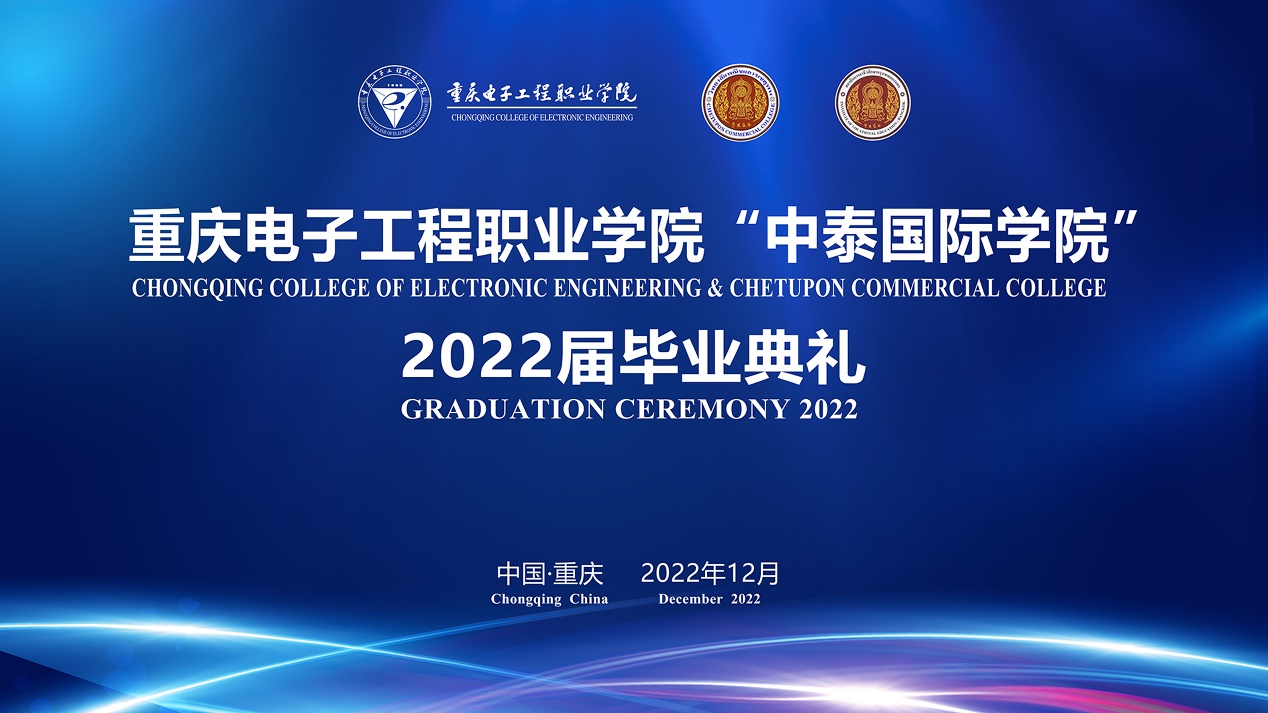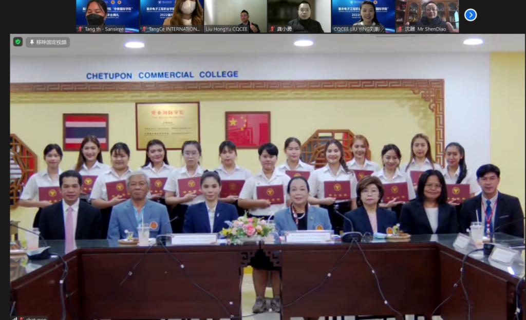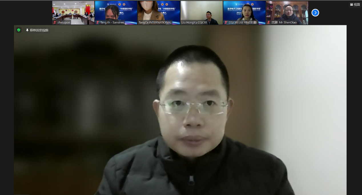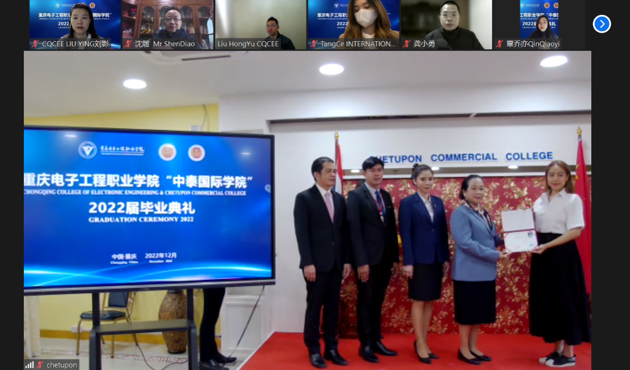 12月17日上午,“中泰国际学院”2022届学生毕业典礼以线上方式在中泰两地同步进行。重庆电子工程职业学院党委副书记龚小勇,曼谷职业教育中心主任冲普努·波邦松,泰国澈督蓬商业学院校长卡娜萨喃潘·蓬他米本,唐风职业教育国际合作部总监庄雷,重庆电子工程职业学院通识教育与国际学院院长沈雕、国际交流与合作发展处处长刘宏宇、副处长刘影等有关负责人以及全体留学生一同出席了毕业典礼。典礼由刘宏宇处长主持。