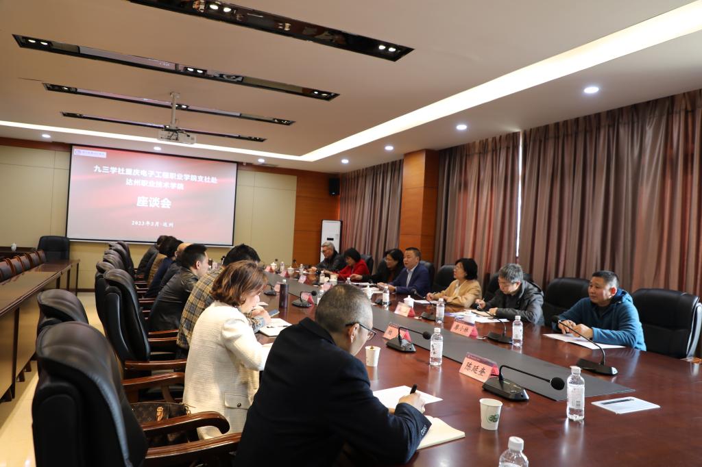 刘洪光对达州职业技术学院取得的优异成绩表示祝贺。他表示统一战线服务川渝万达开地区统筹发展重点是“助推”,根本看“实效”,近年来两校通过人才交流在职业教育发展上取得重要成果,未来两校要始终以“川渝一家亲”的合作理念,建立长期、稳定、全面的交流合作机制,共谋合作,共话发展,扎实推进新时代两校统战工作和职业教育高质量发展。九三学社重庆市沙坪坝区委委员、九三学社重庆电子工程职业学院支社副主委王希琼介绍了九三学社重电支社发展情况以及取得的成果。达州职业技术学院副校长、重庆电子工程职业学院支社主委王正勇回顾总结了两校在“双高”建设和统战方面的合作历程、工作中结成的深厚情谊,并对两校党委的大力支持表示衷心感谢。