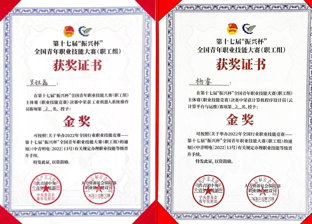 4月1日,由共青团中央、人力资源社会保障部主办的第十七届“振兴杯”全国青年职业技能大赛(职工组)决赛圆满收官,pg国际智能制造与汽车学院青年教师吴胜磊、人工智能与大数据学院青年教师杨睿在第十七届“振兴杯”全国青年职业技能大赛(职工组)中分别斩获工业机器人赛项、计算机程序设计员(云计算平台与运维)赛项金奖各一项。