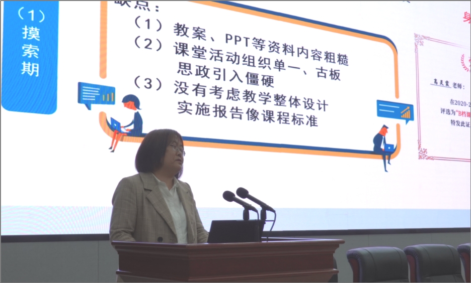 在金课堂教师经验分享环节,马克思主义学院的尚杨老师分享了自己参与教学比赛、金课堂建设的历程和教学反思,并现场展示了一个教学片段;建筑材料学院的邱欣老师从金课堂与教学能力比赛视角分享了作为一个来自企业的教师成长之路;人工智能与大数据学院的高灵霞老师分享了自己连续参加5期金课堂建设的历程和心得体会。