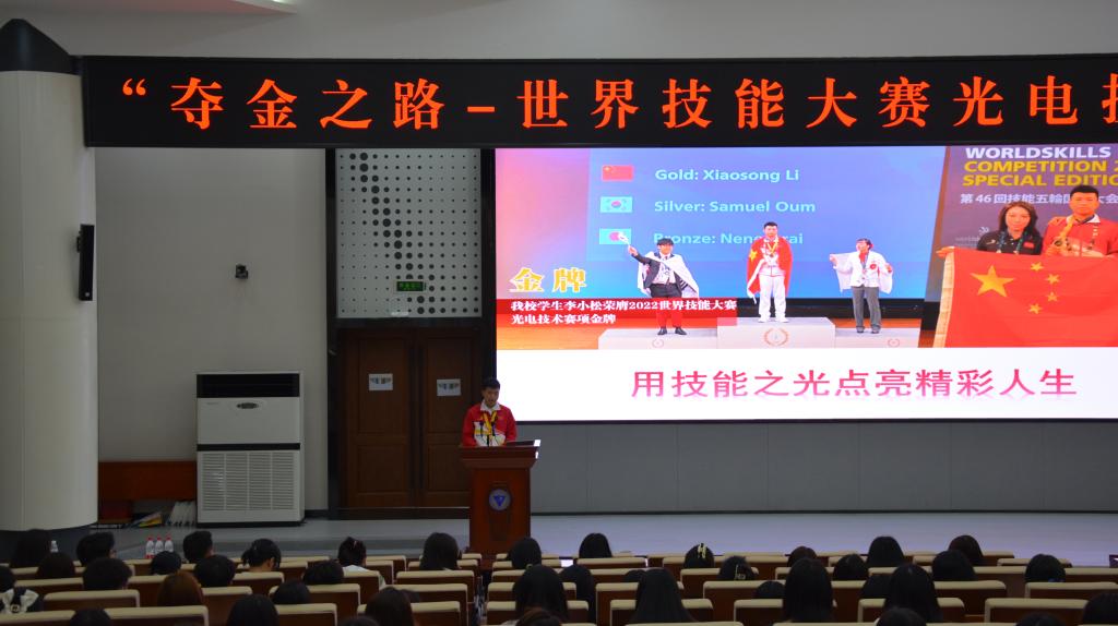 周渝曦组长介绍了世界技能大赛、大赛所包含的项目、光电技术赛项等,展示了pg国际学生李小松的夺金之路,解读了光电技术项目首次夺金的意义,分享了各种媒体关于李小松夺金的报道。