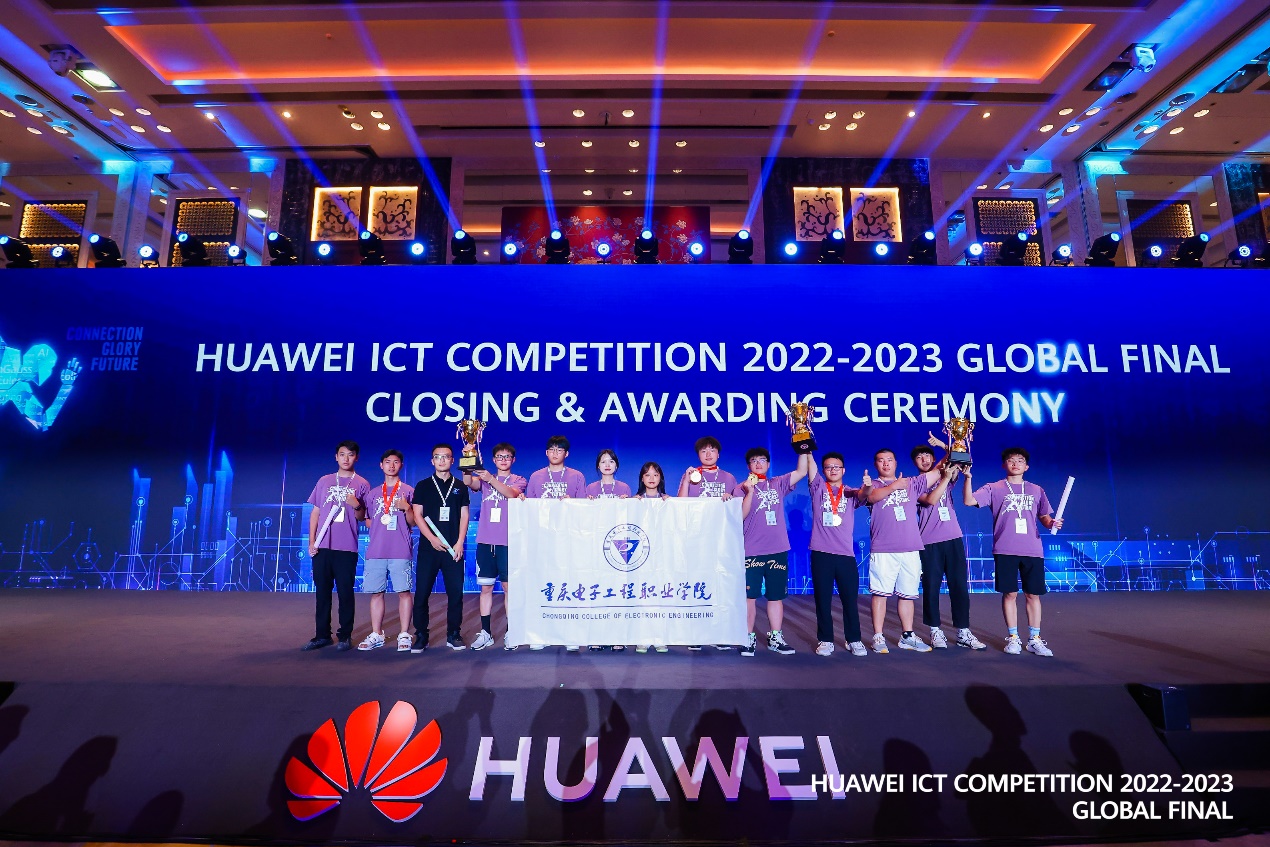2023年5月24日至2023年5月27日,华为ICT大赛2022-2023全球总决赛在广东省深圳市华为总部举行,重庆电子工程职业学院通信工程学院四支参赛队伍与来自36个国家和地区的107支硕博、本专科队伍同台竞技,最终在27日下午的颁奖典礼中脱颖而出,取得特等奖1项,一等奖2项,二等奖1项的优异成绩,展现了通信工程学院近年来在ICT领域深度对接产业发展的人才培养改革取得的成效。