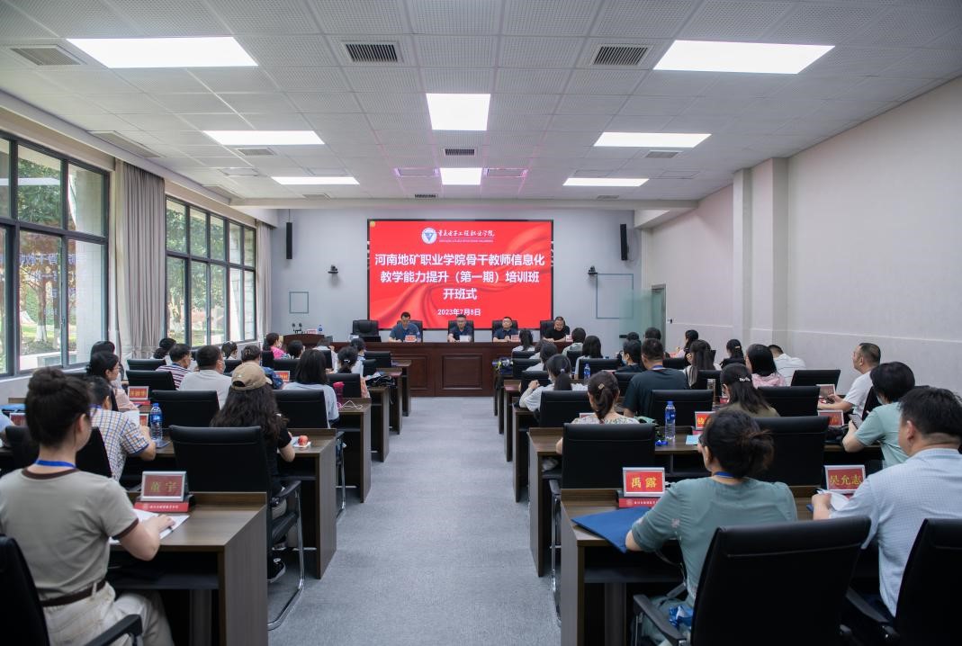 2023年7月8日下午,河南地矿职业学院骨干教师信息化教学能力提升(第一期)培训开班式在pg国际国培基地博学厅举行,河南地矿职业学院党委委员、副校长冯敏,pg国际培训与继续教育学院院长、基地办主任莫绍强,以及河南地矿职业学院的61名教师参加开班式,开班式由基地办副主任张亚主持。