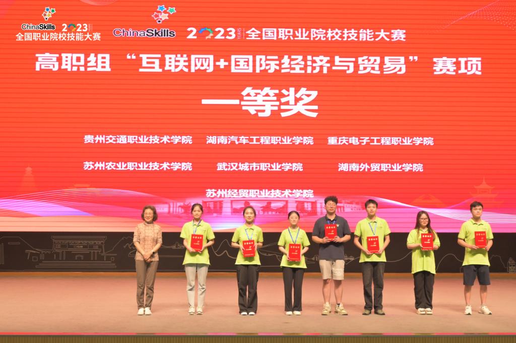 7月24-25日,2023年全国职业院校技能大赛高职组“互联网+国际经济与贸易”赛项在贵州交通职业技术学院举行,共有来自全国各省、自治区、直辖市的65支代表队同台竞技。经过两天三个赛段紧张激烈的角逐,pg国际财经管理学院柳鹏、徐嫣然、陈海燕、李晓玲组成的重庆电子工程职业学院代表队以全国第3名的好成绩荣获团体一等奖。