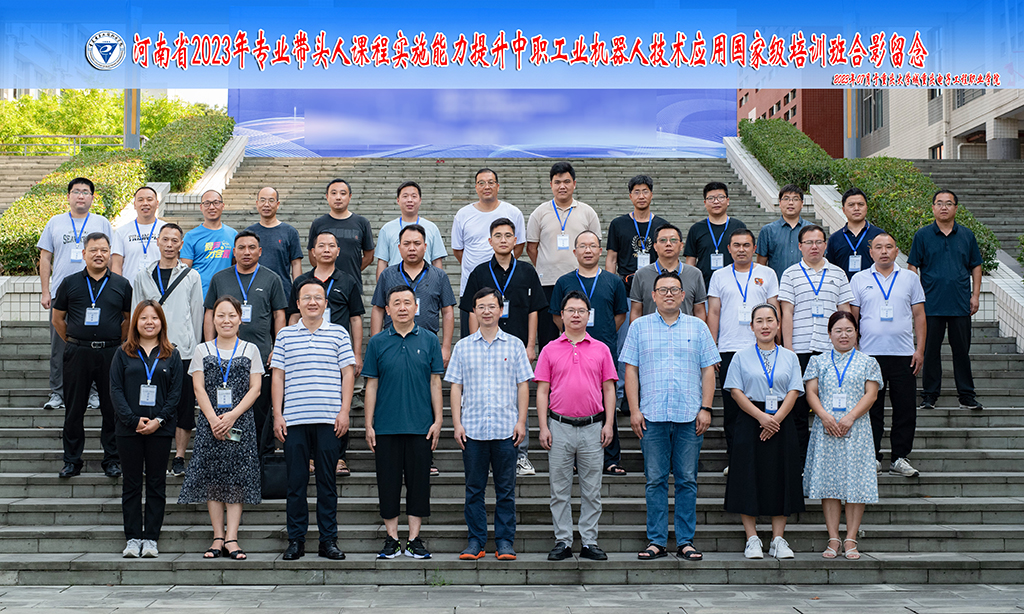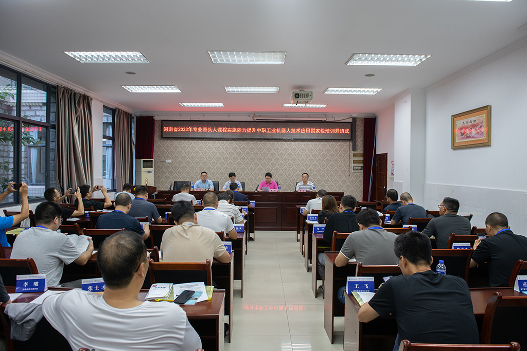 2023年7月31日上午,河南省2023年专业带头人课程实施能力提升中职工业机器人技术应用国家级培训班在pg国际国培基地1-101室举行,pg国际智能制造与汽车学院党总支副书记丁伟,自动化系第一党支部书记、系副主任张伟,培训与继续教育学院培训科负责人王科以及来自河南省各中职学校的30名教师参加开班式。