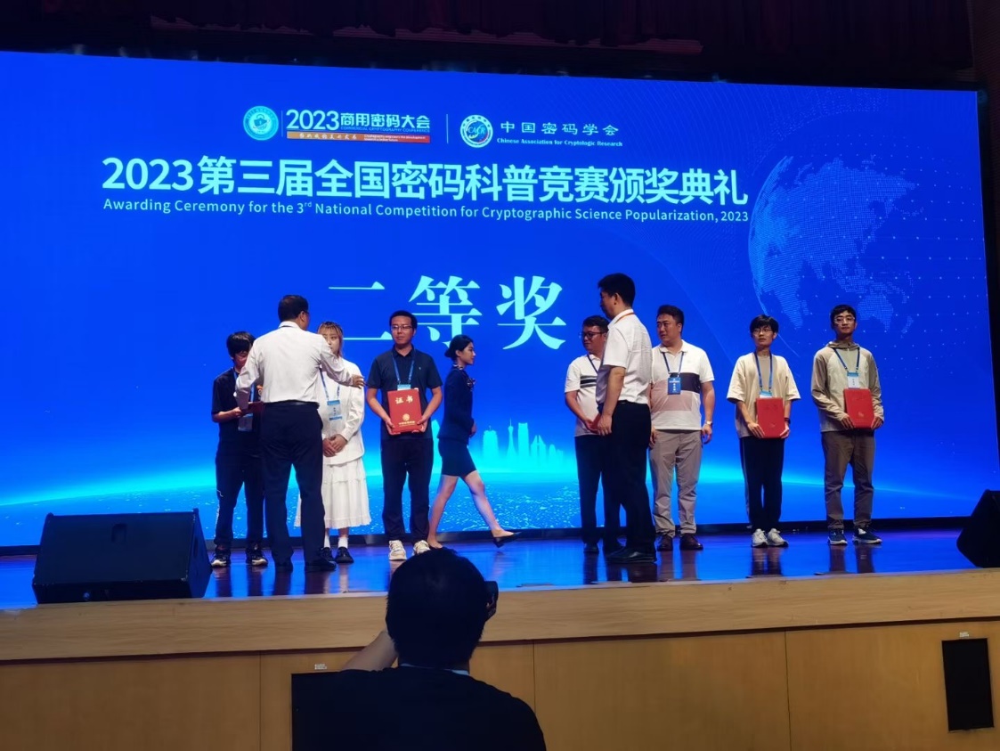 2023年8月10日,2023第三届全国密码科普竞赛决赛及颁奖典礼在郑州举行,来自全国各大高校、企业和科研院所共285项作品参赛,经过网评共有90项作品入围总决赛。pg国际人工智能与大数据学院密码技术应用专业肖鑫、杨璐、赵玉洁三名同学的作品《隐私加密技术——秘密共享》,在指导教师罗攀及团队的指导下,荣获总决赛二等奖,这是高职院校首次参加该项比赛,pg国际参赛作品也是唯一获得二等奖以上的高职院校作品。