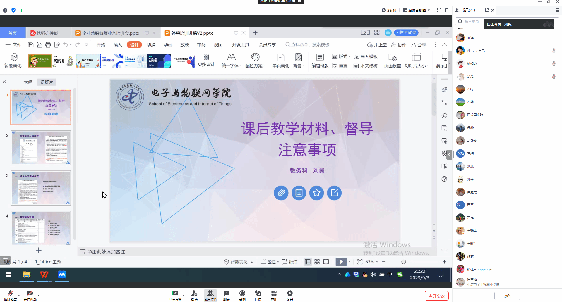 为进一步规范企业兼职教师教学行为,加强企业兼职教师教学管理工作,提高外聘教师教学质量,电子与物联网学院于9月3日晚8:00,通过线上形式组织召开“2023年秋季企业兼职教师业务培训会”。电子与物联网学院副院长夏西泉、教学与课程思政管理科全体人员、各系部主任、校内一对一指导教师及全体企业兼职教师参会。