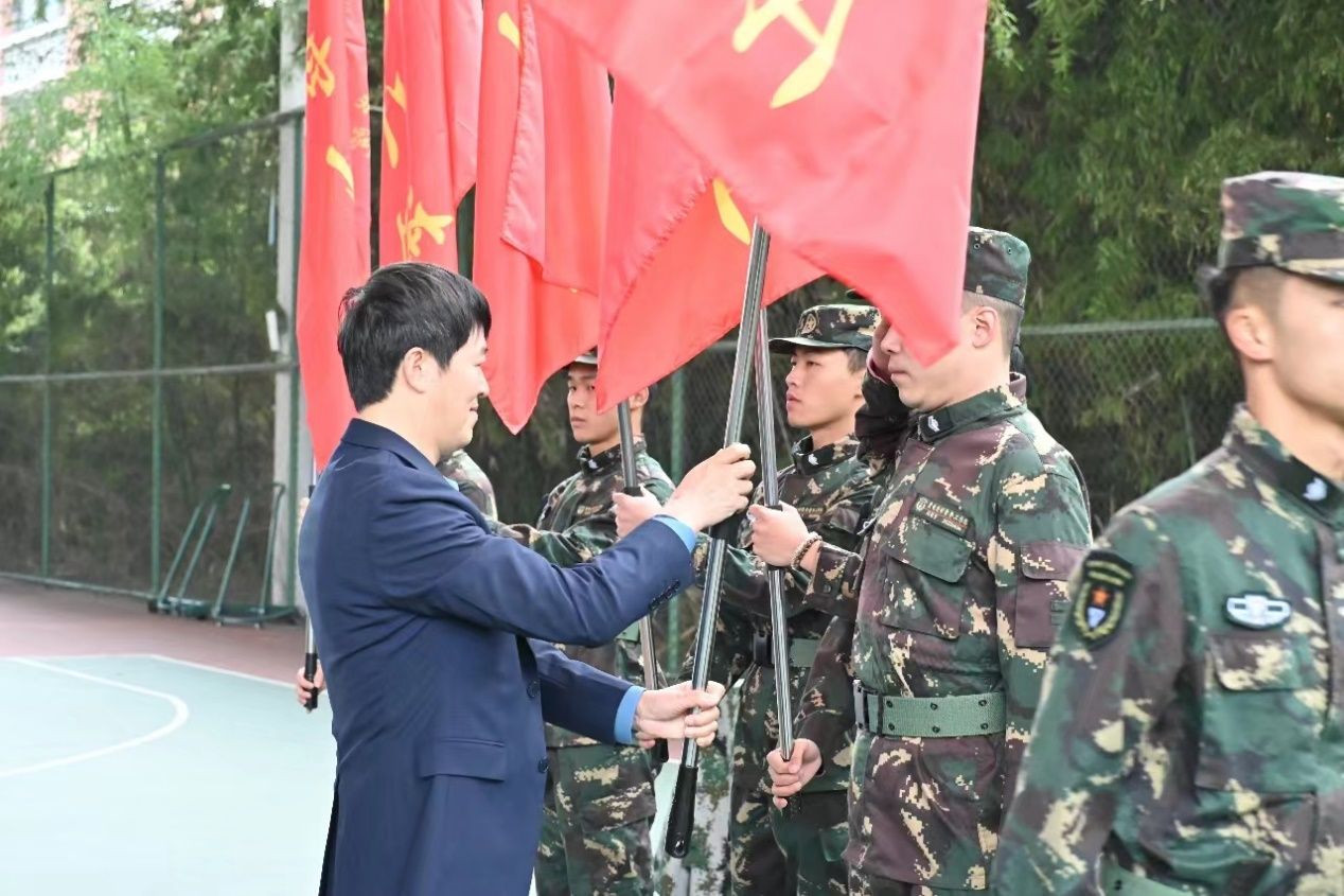 王永中为各连队授旗并作了发言,他表示学工部一直关注军事训练营的工作,对同学们的训练状态十分关心。他希望大家发扬“忠诚奉献,逐梦蓝天”的航空报国精神,认真勤学苦练,塑造优良品德,锻炼强健体魄,养成良好习惯,“与国同行”“与校同行”,努力成为堪担民族复兴重任的时代新人。