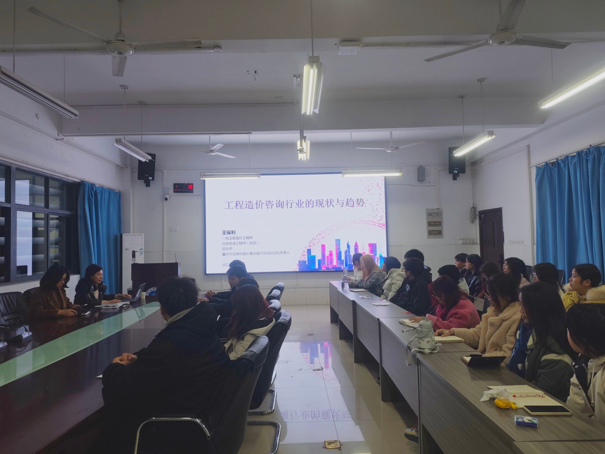 为提升建筑智能化工程技术省级双高专业群卓越技术技能人才培养质量,加强专业群师生对重庆市工程造价咨询行业的认识,2023年12月27日下午,建筑与材料学院邀请重庆市住房和城乡建设造价总站行业科负责人王耀利科长在学院6202会议室开展题为“工程造价咨询行业的现状与趋势”的专题讲座,工程造价专业“数字先锋”卓越班项目负责人李会静老师及工程造价2206班(卓越班)全体学生参加。